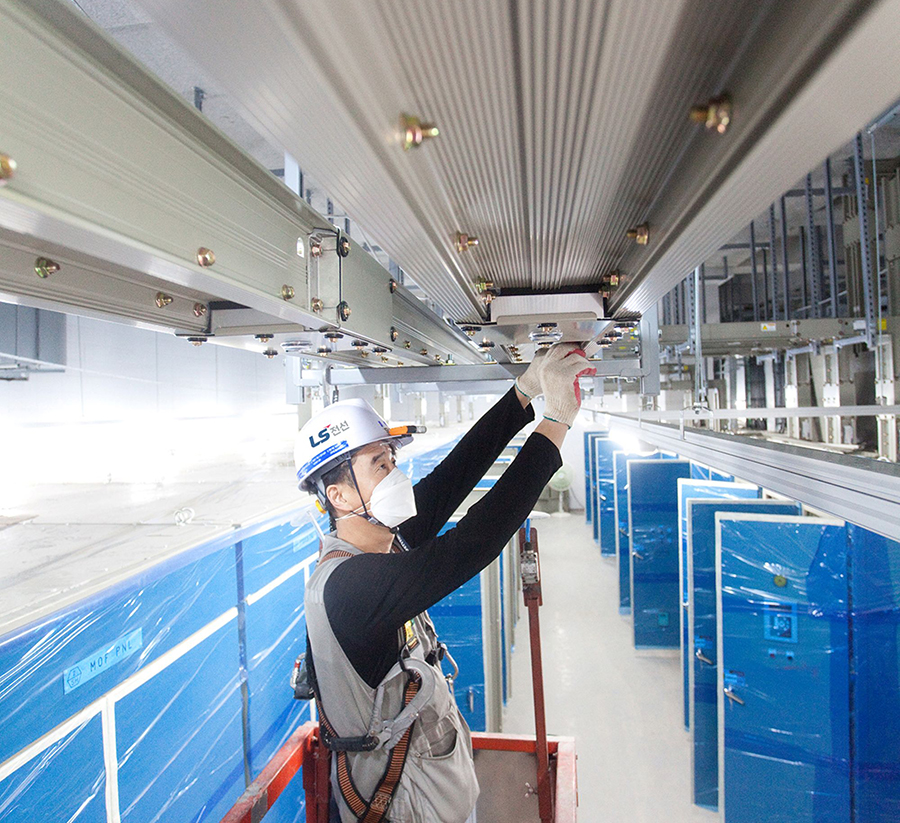 LS전선 직원이 버스덕트 시스템을 설치하고 있다