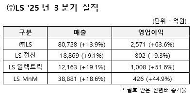 ■ ㈜LS, ‘25년 3분기 전년 동기 대비 매출 13.9%, 영업익 63.6% 증가