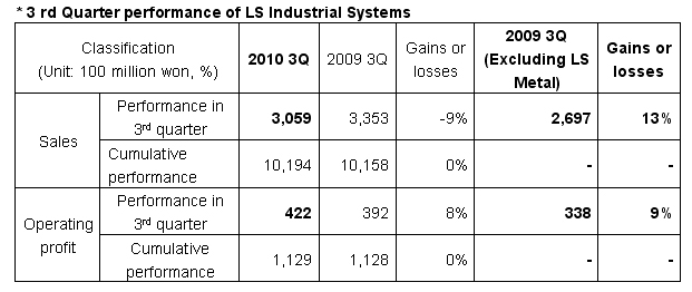 However, based on figures announced in public disclosures, last year’s third quarter performance data included figures from LS Metal, which was spun off last April. Thus, sales declined nine percent, and the operating percentage gained 8%.