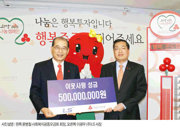 LS그룹(회장 구자홍)은 13일 불우이웃돕기성금 5억원을 사회복지공동모금회에 기탁하고, 계열사별로 복지시설 등을 방문하여 자원봉사활동을 적극 펼치기로 했다.