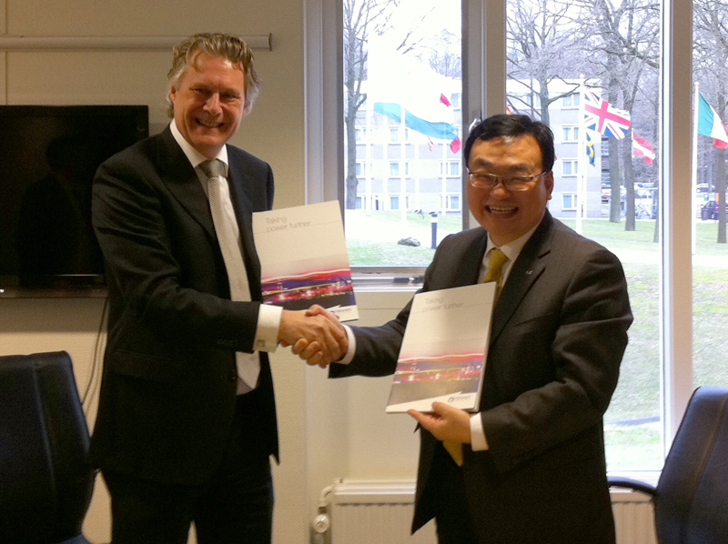 LS전선(대표 구자열)이 네덜란드 전력청이 발주한 95만 유로(한화 약 15억원)규모의 380kV급 초고압 케이블 수주에 성공했다. 이 수주는 380kV급으로는 국내 최초로, 유력 케이블 회사들의 텃밭인 유럽 시장에서 현지 업체들을 제치고 수주한 데 그 의미가 있다. 사진 우측 LS전선 전력사업부장 윤재인 전무, 좌측 네덜란드 전력청 초고압사업본부장 R.J.A.월터스(Wolters).