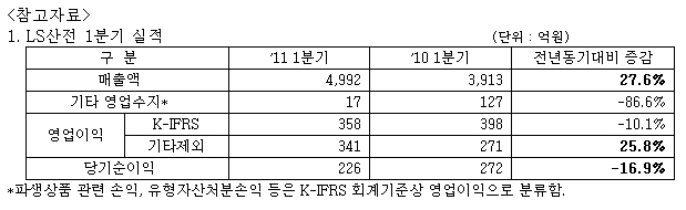 다만 공시기준상 영업이익은 IFRS 회계처리 변경에 따라 지난해 보다 다소 악화된 것으로 보이는 ‘착시현상’이 있을 수 있으나, 이는 전년 1분기 중 발생한 파생상품 관련 이익, 유형자산처분익, IFRS 기준 변경에 따른 대손환입 등 기타영업수익 127억원이 영업이익에 반영된 결과로, 이러한 일시적인 항목을 제외하면 올해 영업이익은 341억원으로, 전년 271억원보다 26% 신장되었다고 LS산전 측은 설명했다.