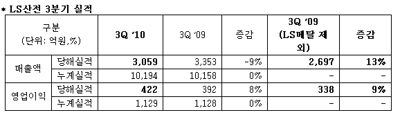 LS산전은 3분기 실적을 집계한 결과, 매출 3,059억원, 영업이익 422억원을 기록했다고 밝혔다.